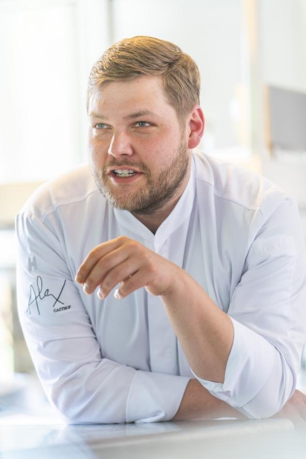 Im Jahr 2021 hatte Domenik Alex den Gasthof seiner Eltern in Gössersdorf übernommen. Zuvor hatte er zehn Jahre lang in hoch dekorierten Sternerestaurants wie dem „Le Noir“ in Saarbrücken, dem Gourmet-Schlosshotel Friedrichsruhe in Zweiflingen oder im „Victor’s Fine Dining“ im saarlän-dischen Schloss Berg Erfahrungen gesammelt. Zurück in seiner nordbayerischen Heimat hat er sich, gemeinsam mit seiner Lebensgefährtin, der Hotelfachfrau Madlen Häckel, den Traum vom eigenen Restaurant erfüllt. Den seit 1886 in Familienbesitz befindlichen Gasthof gestaltete das en-gagierte Gastronomenpaar nach eigenen Vorstellungen komplett um. Jetzt trifft hier urig-fränkische Gemütlichkeit auf klare Linien und geschmackvolle Reduktion auf das Wesentliche. Das gilt für das, was der Gast auf dem Teller hat, ebenso wie für das Ambiente. Von Mittwoch bis Samstag serviert Domenik Alex sein Sechs-Gänge-Menü: eine gelungene Symbiose traditioneller Speisen in neuer, kreativer Machart. Die „Kartoffel mit weißem Käs’“ ist ein typisches Gericht auf der Karte im „Alex“, das für das kulinarische Konzept steht: Eine Küche, die ihre oberfränkischen Wurzeln nicht vergisst, die der Küchenchef aber pur und modern interpretiert.