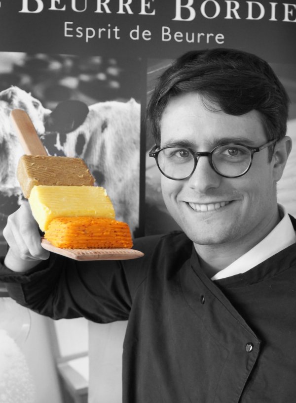 Jean-Yves Bordier – einer der Letzten, der „gute“, handwerkliche Butter so herstellt wie unsere Großeltern es noch kannten: Er und sein Team kneten die geschlagene Butter, so wie früher, in einem Holzzylinder nach. Diese alte, traditionelle Methode, verleiht der Butter ihre einzigartige Struktur und ihr volles, komplexes Aroma. Nachdem er 35 Jahre lang das Affinieren von Käse perfektionierte, wurde 1985 aus dem Käse-Affineur der Butterhandwerker in St. Malo, wo er das Maison du Beurre betreibt- das „Haus der Butter“. 2003 wurde Maître Bordier vom Guide Champérard als bester Genusshandwerker Frankreichs ausgezeichnet. Nach einer Vorstellung der Manufaktur und des Handwerks durch Amaury Pasquier, Export Manager aus dem Hause Bordier, folgt eine Degustation von folgenden Butter-Spezialitäten: „Le beurre doux“ mit dem Vergleich einer „Beurre de Baratte Doux“ und einer „Beurre Bordier Doux „sowie „Le Beurre Demi-Sel“. Anschließend werden acht der „beurres parfumés“ verkostet: aux Alges / Yuzu / Huile d´Olive Citronée / au Sarasin / l’Oignon de Roscoff/ au sel fumé / au Piment d´Espelette / à la Vanille. Um auch das Käse-Handwerk nicht aussenvor zu lassen gibt es zum Abschluss eine besondere Spezialität aus dem Hause Bordier: den „Yellow Bleu“, eine Mischung aus Yuzu-Butter und Stilton.